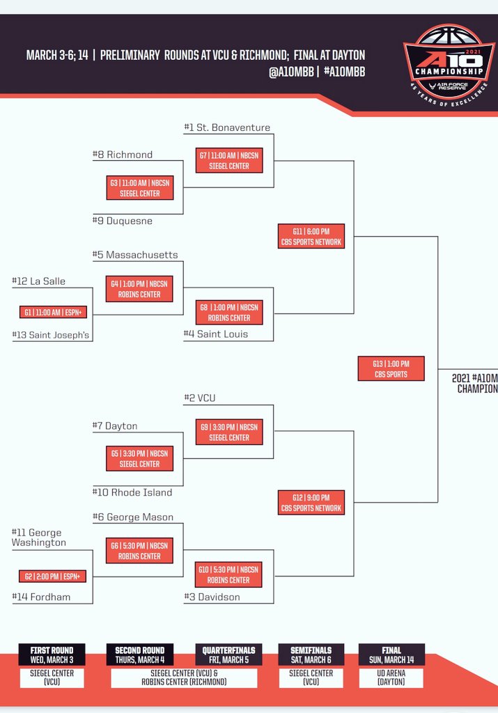 All of that means we’re expecting a hell of a tournament full of upsets, surprising runs, and low seeds advancing much further than their regular season standing would suggest. Here’s everything you need to know to get you ready for the start of the Atlantic 10 Tournament.