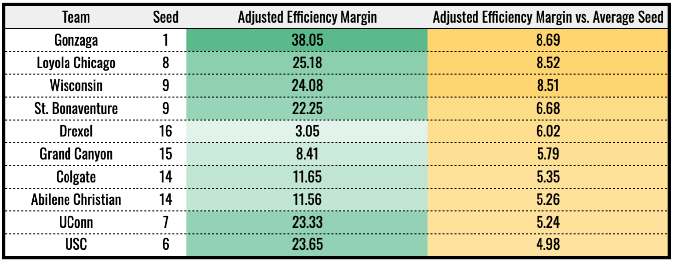 While it might be hard to believe, No. 1 seed Gonzaga enters the field of 68 with the highest positive differential in adjusted efficiency margin vs. its seed. The Bulldogs have been that dominant on both sides of the ball and should enter the tournament as firm favorites to cut down the nets.