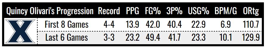 The key to getting over that hump and getting back into the NCAA Tournament picture rests with Quincy Olivari. The Rice transfer has taken his game to a new level since that loss to Houston, leading to two of Xavier’s biggest wins of the season (Cincinnati, Seton Hall) and a near-upset of Villanova.