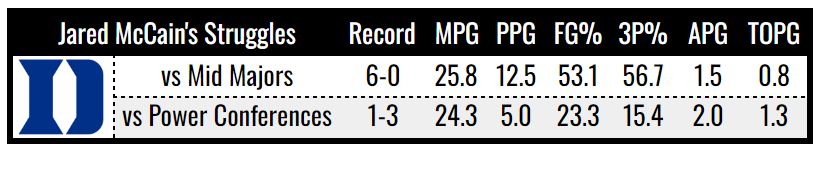 The five-star freshman has been that guy against Duke’s weaker opponents. However, when the Blue Devils have faced higher-level competition, McCain becomes virtually invisible: