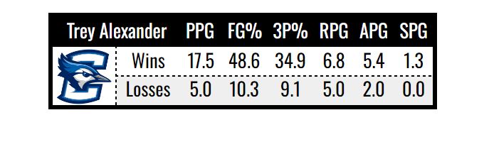 Those losses have also coincided with a major dip in production from Trey Alexander, Creighton’s best pro prospect. Here are his win/loss splits this season: