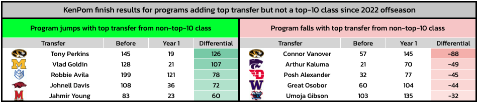 As for the mainstays atop the coaching ranks, the 13 remaining top-10 transfer classes over the last three years were recruited by longstanding sideline generals (3+ years at their school). Nine of the 13 programs improved, including Creighton jumping from No. 50 to No. 12 with Baylor Scheierman and Francisco Farabello and North Carolina leaping from No. 43 to No. 9 with Harrison Ingram and Cormac Ryan.