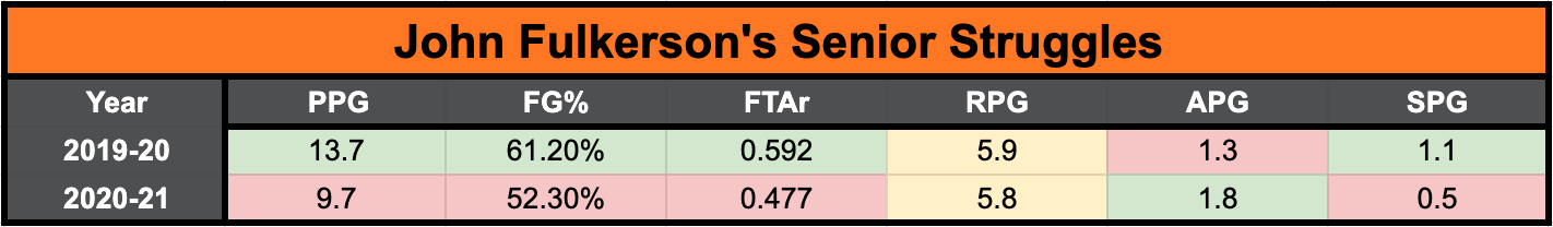 Their inability to find consistent scoring has been a major downfall this season. Each of their final four scheduled regular season games will come against teams that will not reach the NCAA Tournament. This would be a great time for the Volunteers to show improvement offensively heading into the Big Dance. Perhaps most notably, John Fulkerson has really struggled this season: