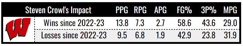 Wisconsin started playing its brand of defense again and controlled all those games on the class. It also got solid performances out of Steven Crowl, the 7-footer who has proven he can be a good secondary scoring option. Crowl has scored at least 13 points in five of those six games, all while shooting a high percentage from the floor and grabbing just under nine rebounds per game. In those two losses to the Vols and Friars, he was inefficient and averaged just 9.0 points.