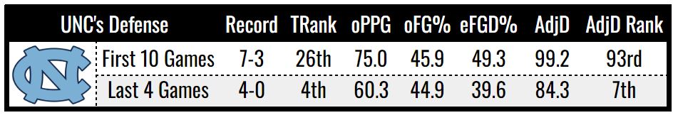 After giving up 87 points in losses to both UConn and Kentucky, the Heels have made adjustments on that end that are working to perfection. Increased pressure on the perimeter, mixing ball-screen coverages and changing philosophies on defensive switches to avoid having guards stuck on opposing big men and vice versa have helped transform the Heels from having a solid unit to a great one in recent weeks.