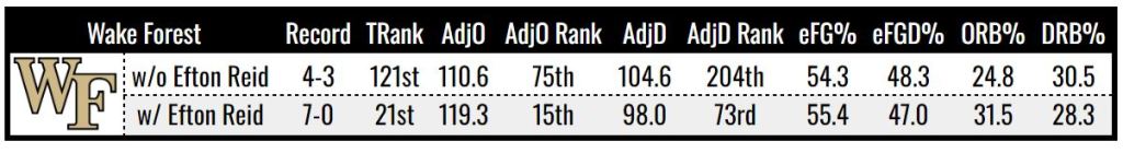 Reid, a transfer from Gonzaga who started his career at LSU, was not eligible to play this season until Wake Forest won his appeal in early December. This has been a different group with the big man in tow, as his elite rim protection and rebounding have provided a boost exactly where the Deacs needed it.