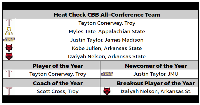 The emergence of Izaiyah Nelson (9.8 ppg, 7.6 rpg, 2.0 bpg) as an elite rim protector bolstered an otherwise lackluster defense, and a late offensive surge indicates a breakout may be coming. Taken together, no one else in the Sun Belt returns as much proven production. Then throw in Nelson’s progression, Julien’s arrival and another year under Hodgson, and the Red Wolves are the clear favorites to win the league.