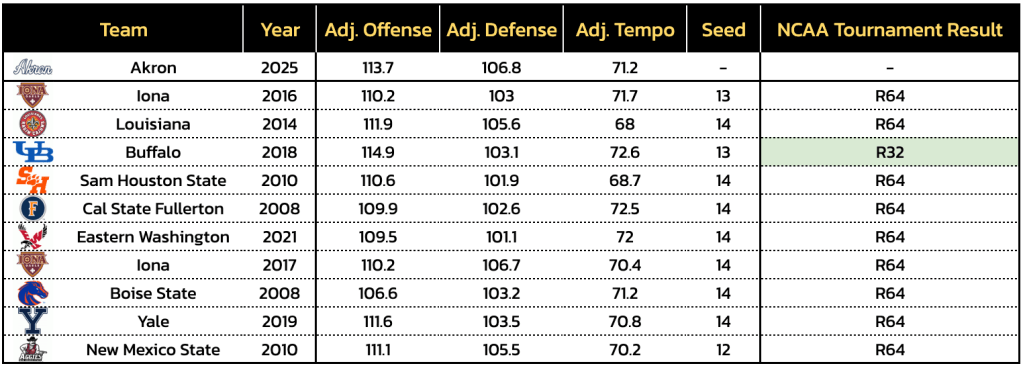 As it stands, Akron is a projected No. 13 seed by our bracketology at Heat Check CBB and on the Bracket Matrix. The Zips would be equivalent to the 24th-strongest No. 13 seed from the past 10 tournament fields according to the Tournament Index.