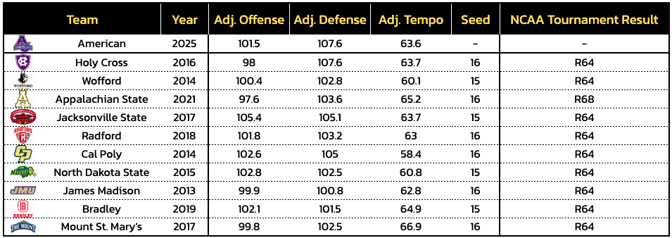 As it stands, American is a projected No. 16 seed by our bracketology at Heat Check CBB and on the Bracket Matrix. The Eagles would rate as the fourth-weakest No. 16 seed of the last 10 seasons (40 total No. 16 seeds) by the Tournament Index. If the Eagles move up a line, they would be the weakest No. 15 seed of the last 10 years.