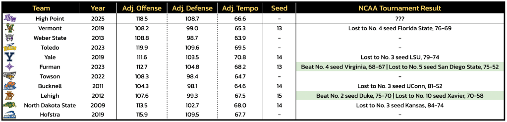 As it stands, High Point is a projected No. 13 seed by both our bracketology at Heat Check CBB and the Bracket Matrix. The Panthers would rate as the 12th-strongest No. 13 seed of the last 10 seasons (40 total No. 13 seeds) by the Tournament Index. The eleven No. 13 seeds with higher TI ratings over the last 10 years have combined for six NCAA Tournament wins, while the 29 with lower TI ratings have combined for just three. Should the Panthers move up or down, they would be either the 31st-strongest 12-seed of the last 10 years or the seventh-strongest 14-seed.