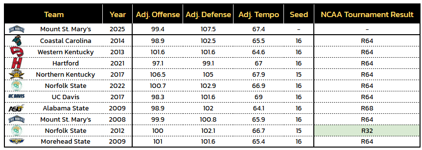As it stands, Mount St. Mary’s is a projected No. 16 seed by our bracketology at Heat Check CBB and on the Bracket Matrix. The Tournament Index rates the Mountaineers as below-average as compared to the No. 16 seeds that made the Round of 64 over the past 10 seasons. If they move up a line, they would rate as weaker than any other No. 15 seed from the last 10 years.