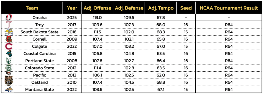 As it stands, Omaha is a projected No. 16 seed both by our bracketology at Heat Check CBB as well as on the Bracket Matrix. Should that be the case, Omaha would rate as a middle-of-the-road 16-seed and would be tied for 17th-strongest of 41 such teams as measured by the Tournament Index.