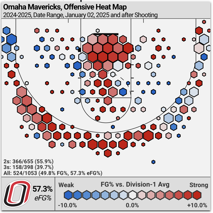 Omaha ranks just 179th in 3-point attempt rate, but the Mavericks are deadly accurate. They rank 45th in 3-point percentage, proving particularly dangerous on above-the-break 3s. Omaha shoots a blistering 38.6 percent on such attempts — 98th percentile nationally — and have improved as of late. They lead the country in this category since Jan. 2, hitting an astounding 42.3 percent over this stretch.