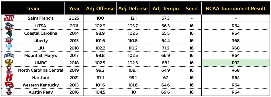 As it stands, Saint Francis is a projected No. 16 seed by our bracketology at Heat Check CBB and on the Bracket Matrix. The Red Flash rate as the weakest No. 16 seed of the last 10 seasons (40 total No. 16 seeds) by the Tournament Index. That said, as shown above, one of their most similar efficiency profiles is that of 2018 UMBC, which became the first-ever No. 16 to beat a No. 1 seed.