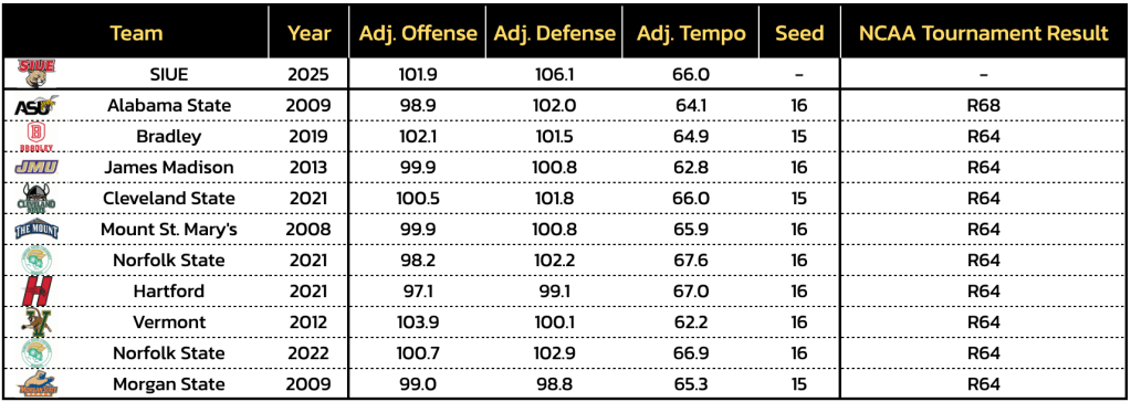 As it stands, SIUE is a projected No. 16 seed both by our bracketology at Heat Check CBB as well as on the Bracket Matrix. Should that be the case, SIUE would rate as a middle-of-the-road 16-seed (19th-strongest of 41 such teams as measured by the Tournament Index).