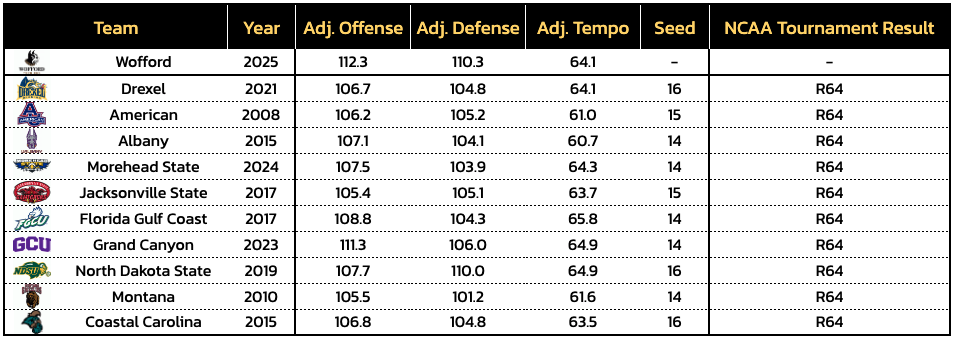 No. 15 seeds with TI power ratings over 53.6 (15 teams) have combined for eight NCAA Tournament wins over the last 10 years, bolstered by 2022 St. Peter’s winning three games. No. 15 seeds below that mark (25 teams) have only won two games, both by 2021 Oral Roberts. Wofford is currently rated at 54.6.