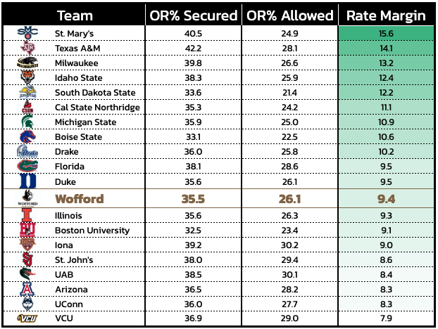 Wofford has won the offensive rebounding rate battle in 25 of its 34 games this season, going 17-8 in those contests. On the other hand, the Terriers were just 2-7 in games where they posted a lower rebounding rate than their opponent. They enter the NCAA Tournament having notched the better rebounding rate in five straight contests.